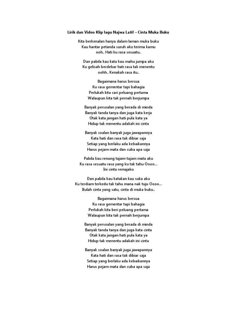 Dan pabila kau kata kau mahu jumpa aku. Lirik Lagu Cinta Muka Buku Najwa Latif Kita berkenalan hanya dalam laman muka buku Kau hantar pesan dan suruh aku terima kamu Oh oh hatiku rasa sesuatu Dan pabila kau kata kau mahu jumpa aku Ku gelisah berdebar hati rasa tak menentu Oh oh benarkah rasa itu Bagaimana Harus bersua. Kita berkenalan hanya dalam laman muka buku kau hantar petanda suruh aku terima kamu.